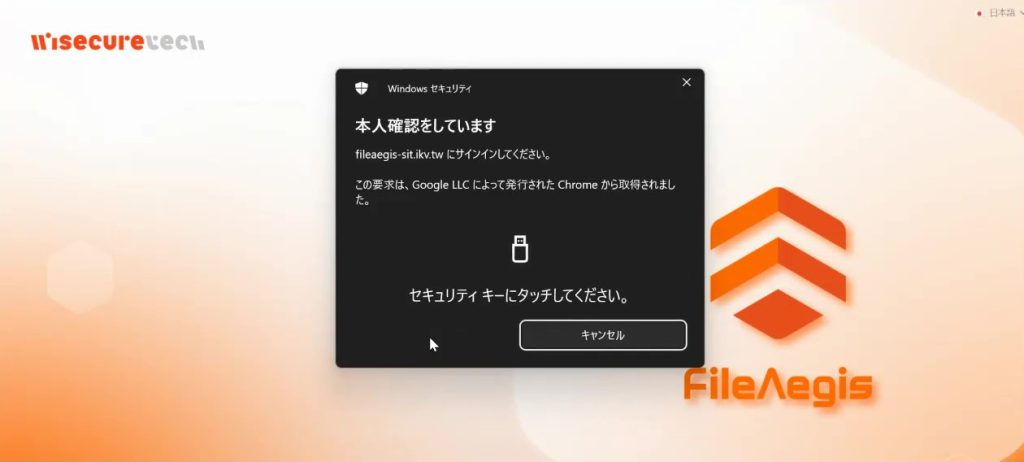 [本人確認]のポップアップウィンドウが表示された後、AuthTron® のセキュリティキーをコンピュータのUSBポートに挿入してください。